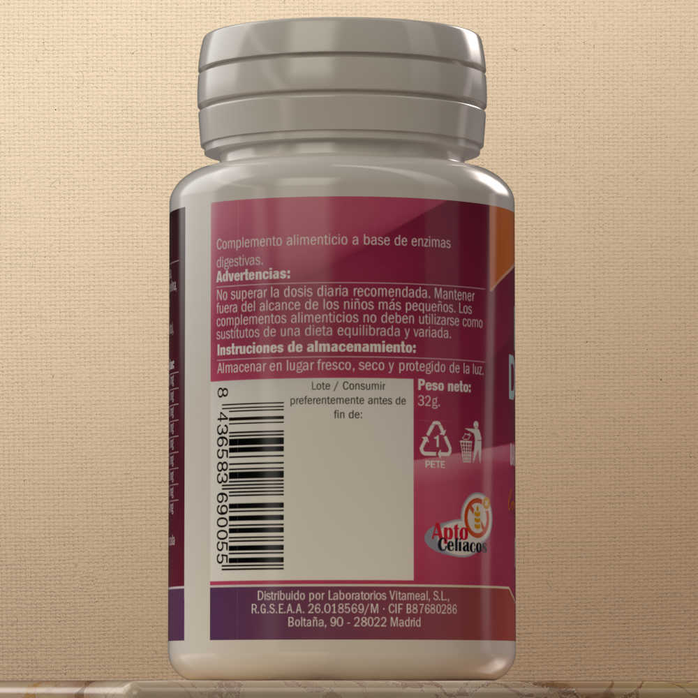 Agente de carga (celulosa microcristalina), amilasa, clorhidrato de betaína, proteasa, pancreatina, bromelina, agente de carga (fosfato dicálcico), piña (Ananas comosus, tronco), antiaglomerante (estereato de magnesio), Extracto de papaya (Carica papaya, fruto), pepsina y lipasa.