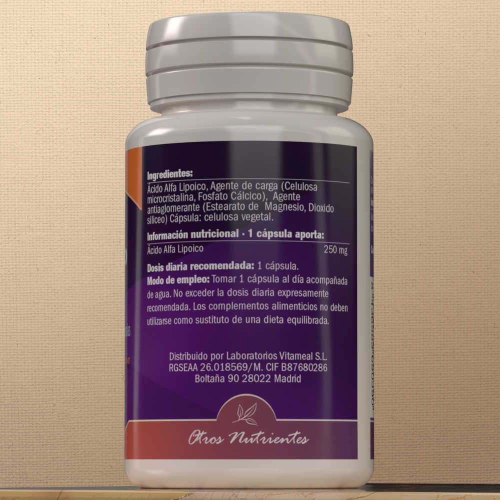 Ácido Alfa Lipoico, Agente de carga (Fosfato dicálcico), Agente de recubrimiento (Gelatina bovina, colorante natural). Agente antiaglomerante (Estereato de Magnesio, silicio).