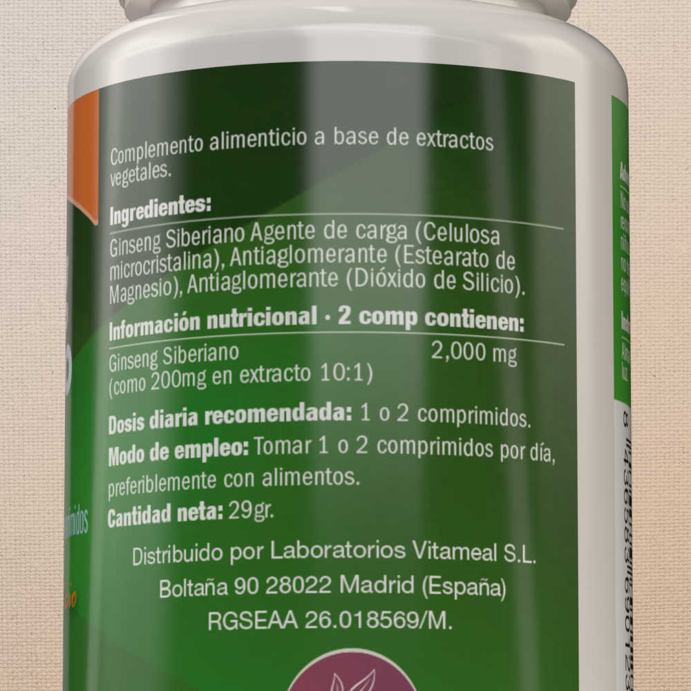 Ginseng Siberiano, Agente de carga (Carbonato de calcio), Agente de recubrimiento (Celulosa microcristalina), Antiaglomerante (Estereato de Magnesio), Espesante (Dióxido de Silicio).